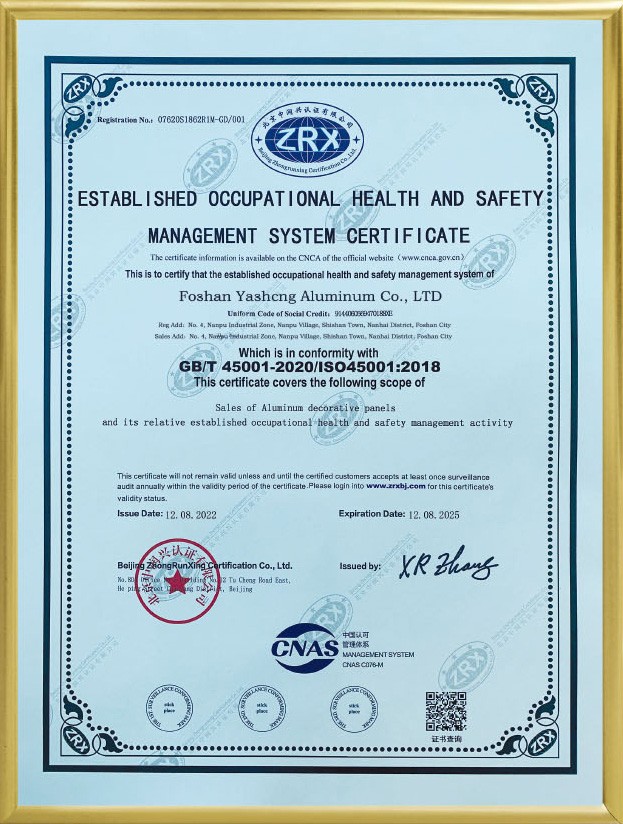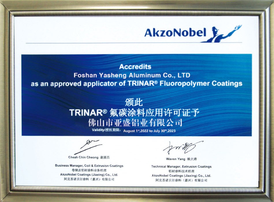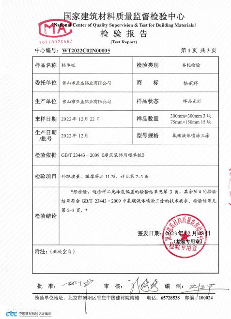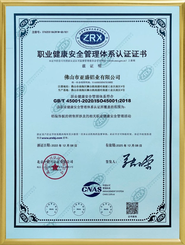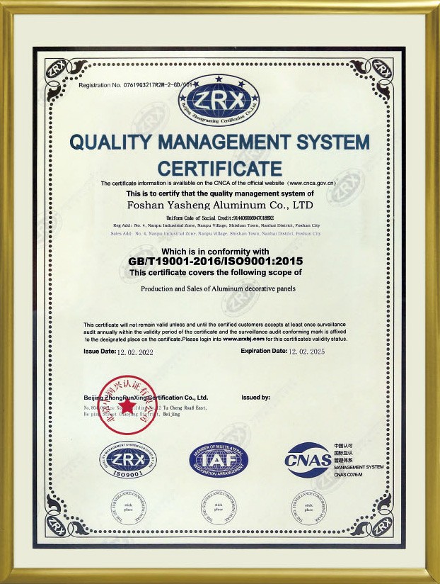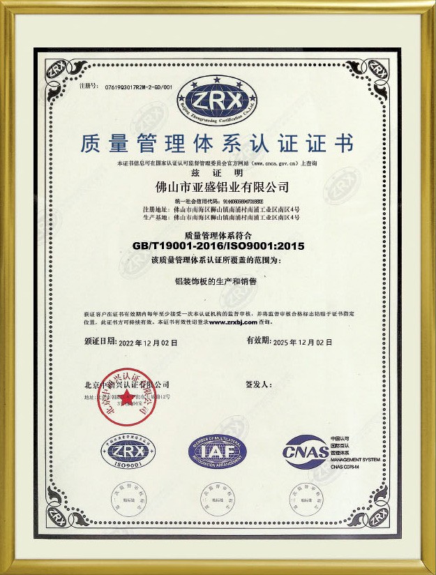 公司現(xiàn)已全面通過ISO9001:2008國際質(zhì)量管理體系認(rèn)證。鋁單板和鋁蜂窩板的產(chǎn)品質(zhì)量均通過了國家建材測試中心檢測。涂層質(zhì)量技術(shù)已達(dá)到美國AAMA2605的要求。板材的物理性能和其他質(zhì)量技術(shù)指標(biāo)均達(dá)到美國ASTM標(biāo)準(zhǔn)。公司本著“重質(zhì)量、重誠信、重創(chuàng)新、重服務(wù)”的理念,堅持用戶至上,服務(wù)周全原則,用心解決客戶所憂;以科技和優(yōu)質(zhì)產(chǎn)品服務(wù)客戶;始終堅持以“想顧客之所想,急顧客之所急”的經(jīng)營理念,不斷開拓創(chuàng)新,與時俱進(jìn),使“亞盛”品牌系列產(chǎn)品得到市場、客戶和專家的一致認(rèn)可和深受廣大國內(nèi)外客戶的好評。